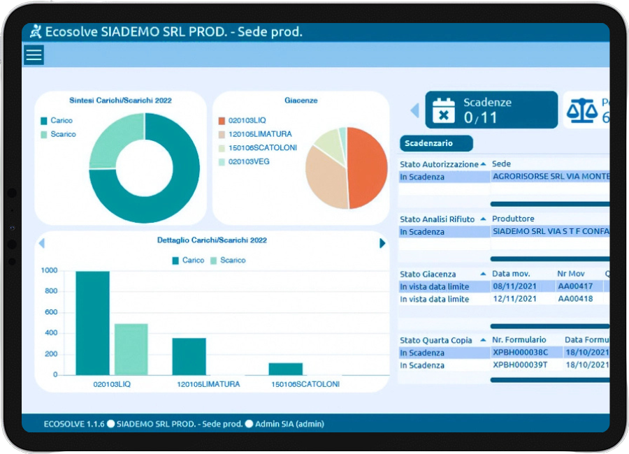 Non solo compliance, ma anche organizzazione e performance: Ecosolve ti avvisa in caso di autorizzazioni in scadenza, quarte copie mancanti o analisi da aggiornare, aiutandoti a prevenire errori e a pianificare ogni attività con precisione. Grazie alla gestione avanzata delle giacenze, puoi monitorare quantità, età e provenienza dei rifiuti accumulati, programmando smaltimenti in modo proattivo.